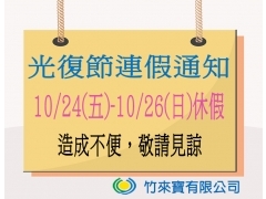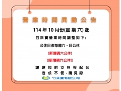 週六營業時間異動公告《 週六營業時間調整通知》 親愛的水水、大大們您好 感謝您對竹來寶的支持 為了提升更優質的服務品質 自 2025/10/01日起 每週六營業時間更改為公休 造成不便敬請見諒 謝謝‼了解更多
